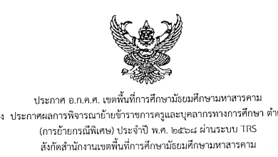 ประกาศ อ.ก.ค.ศ. เขตพื้นที่การศึกษามัธยมศึกษามหาสารคาม เรื่อง ประกาศผลการพิจารณาย้ายข้าราชการครูและบุคลากรทางการศึกษา ตำแหน่งครู (การย้ายกรณีพิเศษ) ประจำปี พ.ศ. ๒๕๖๘ ผ่านระบบ TRS สังกัดสำนักงานเขตพื้นที่การศึกษามัธยมศึกษามหาสารคาม